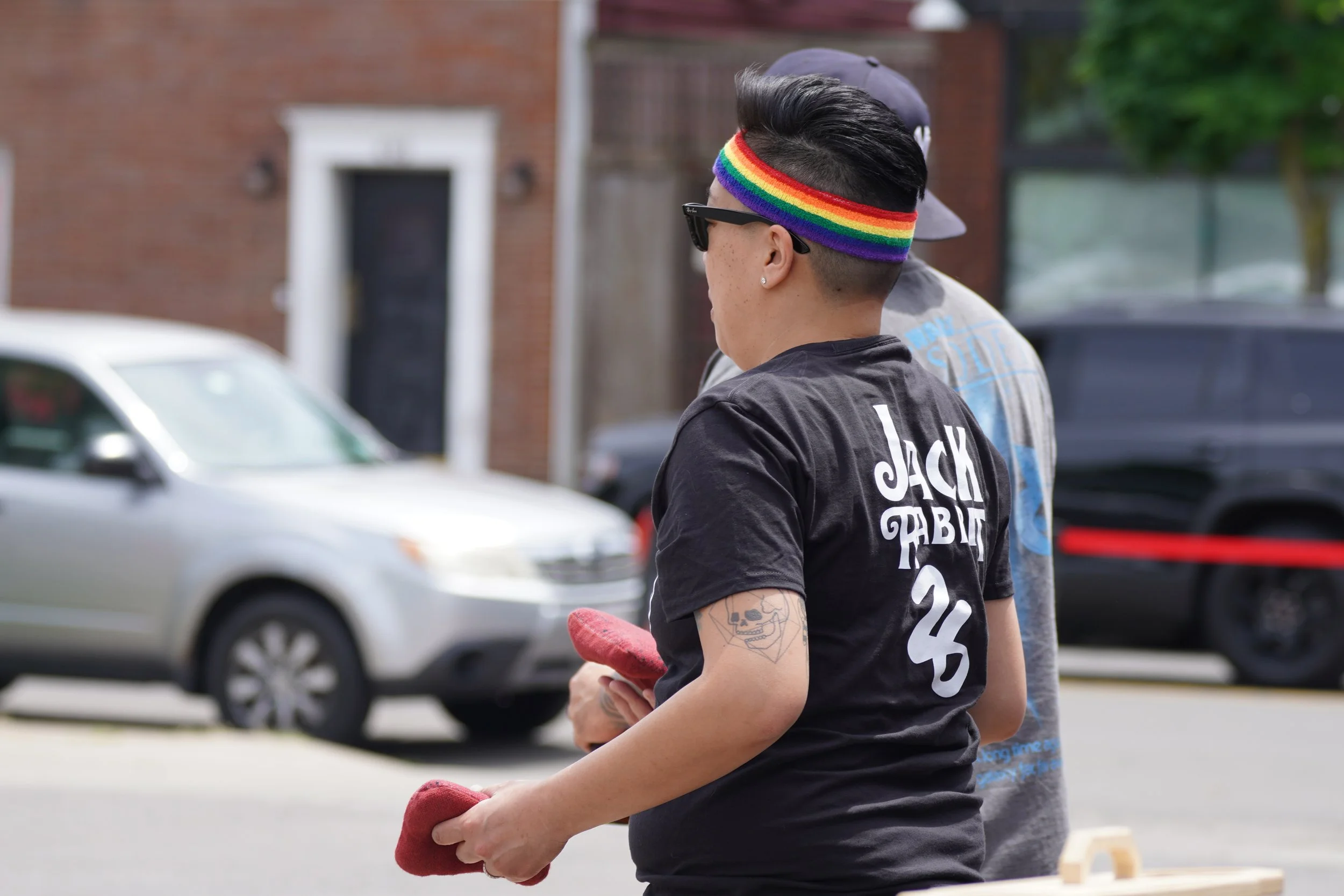 Person with a rainbow headband, sunglasses, and a tattoo on their arm holding a red object, standing outdoors near parked cars and a brick building.