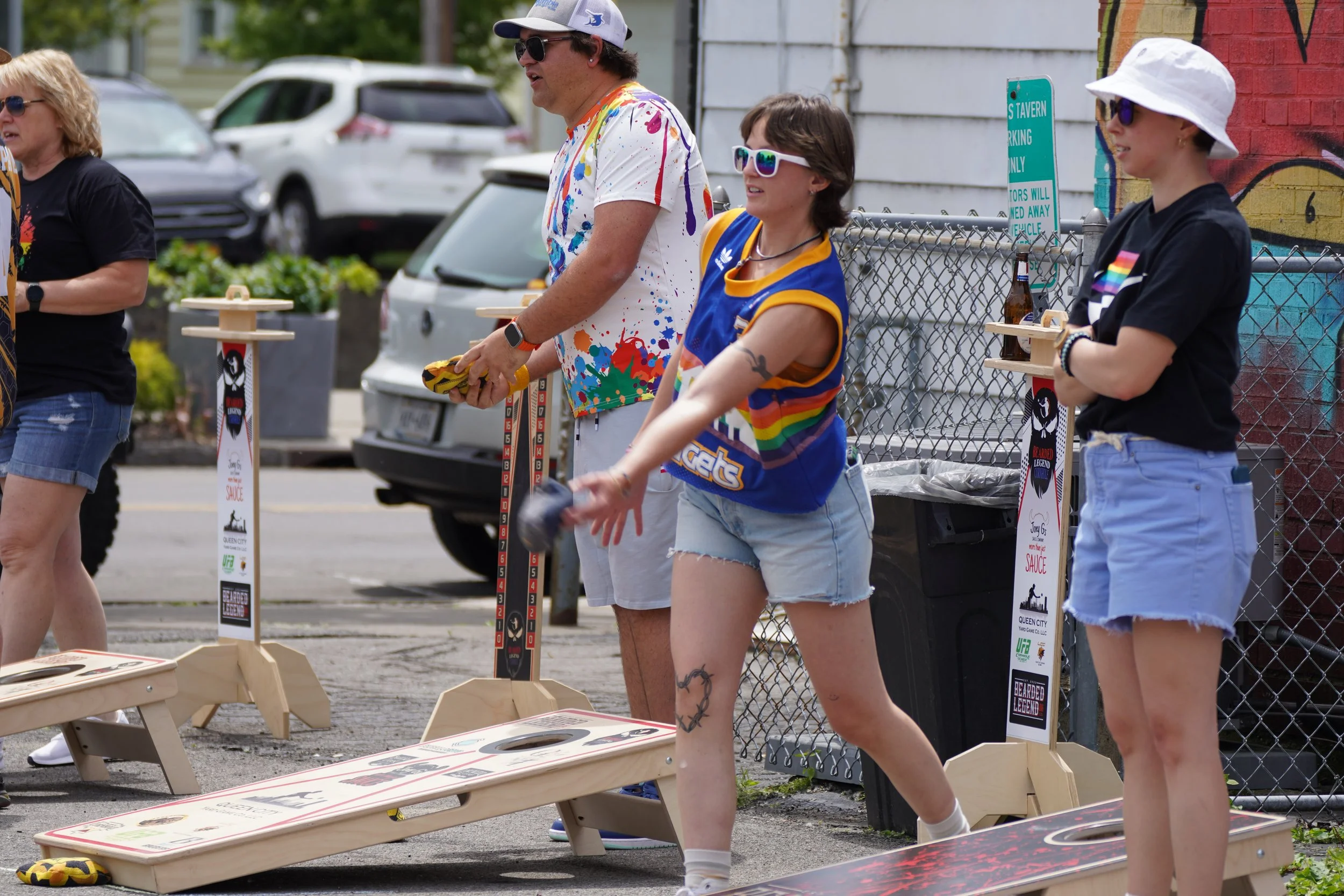 Group of people playing cornhole outdoors, wearing casual clothes and sunglasses, with a chain-link fence and parked cars in the background.