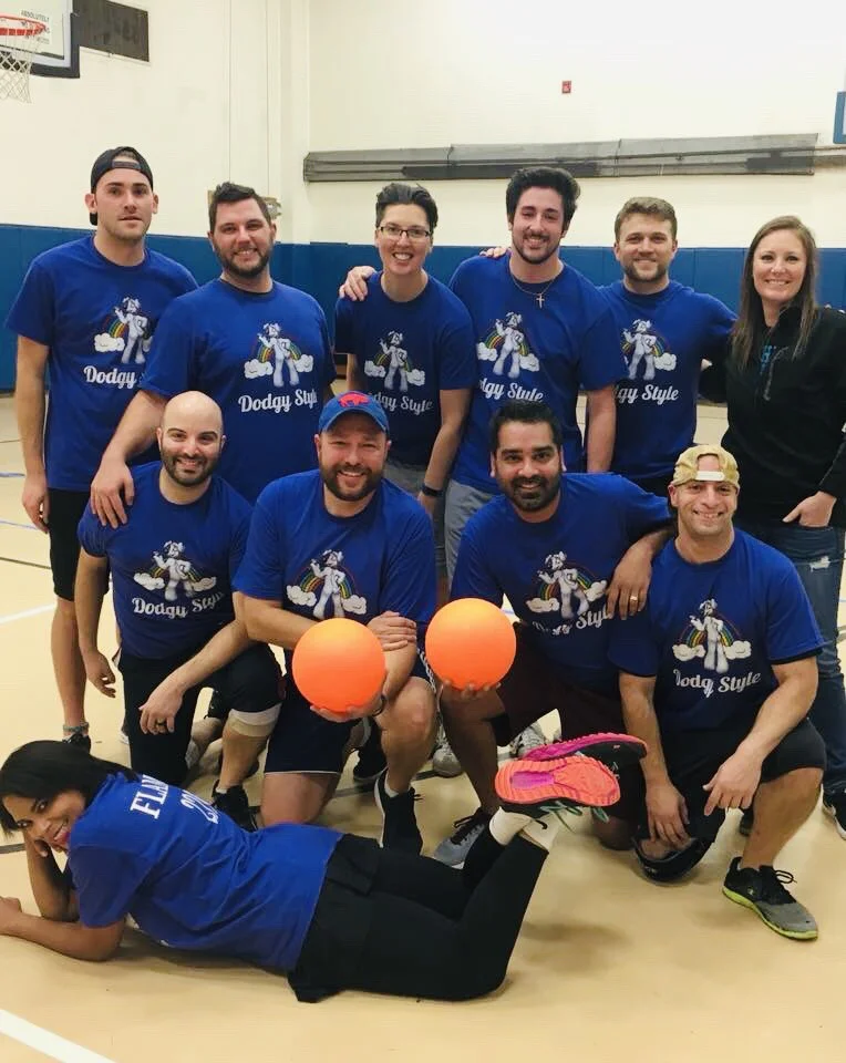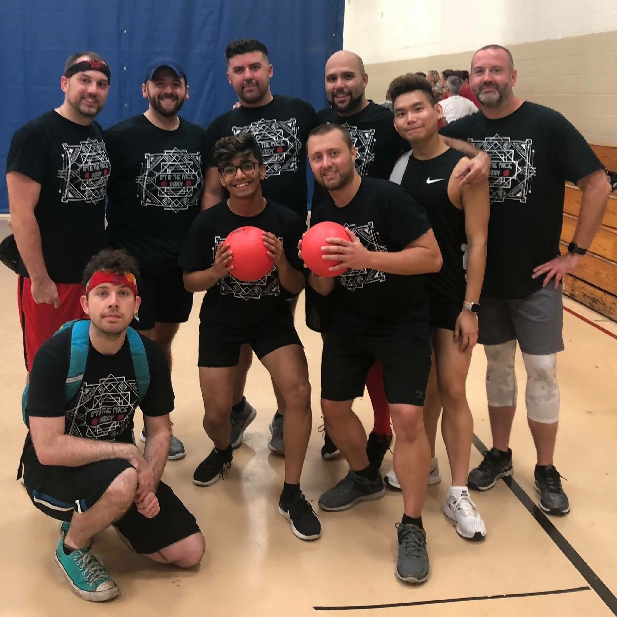 Group of ten people in blue t-shirts gathered in a gymnasium, posing for a photo. One person is lying in front, while two others in the middle hold orange balls. Everyone appears to be smiling and enjoying themselves.
