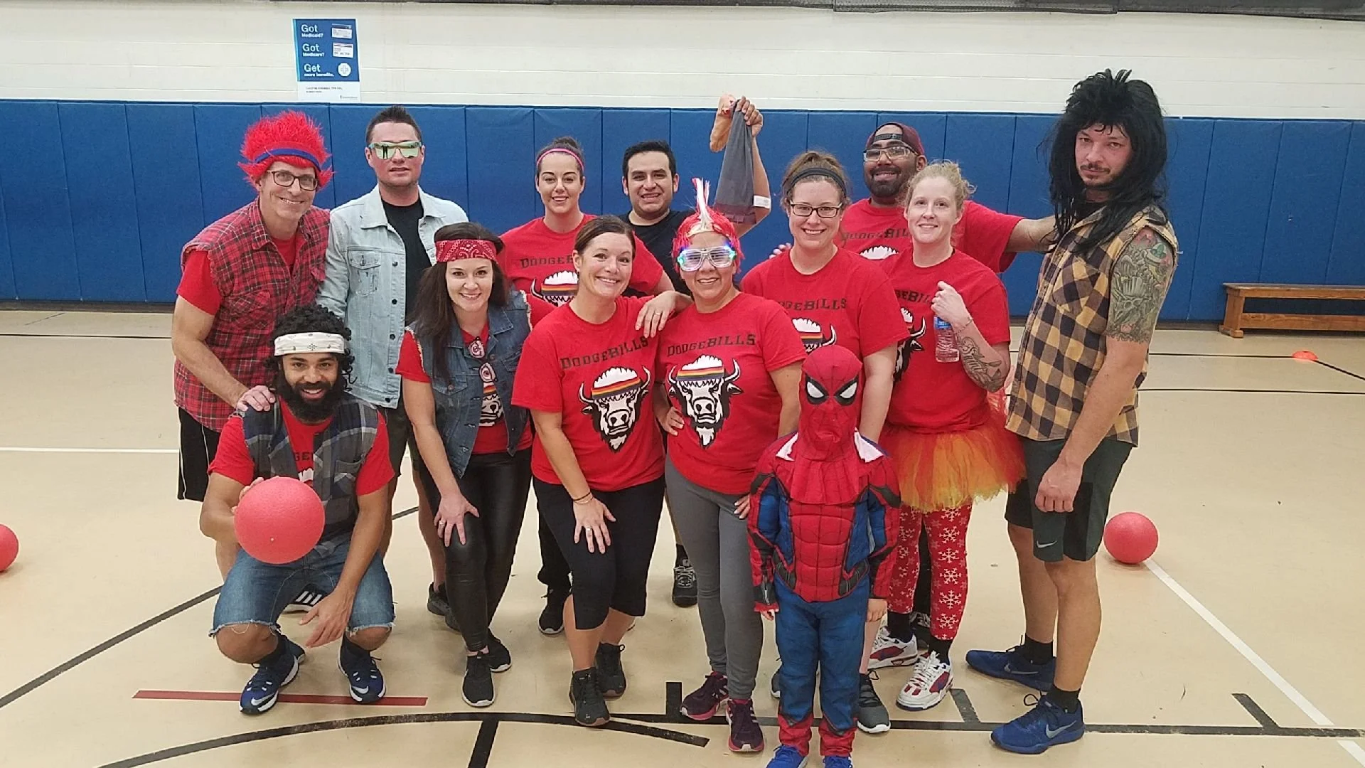 Group of people dressed in fun costumes and festive attire in a gymnasium, celebrating together.