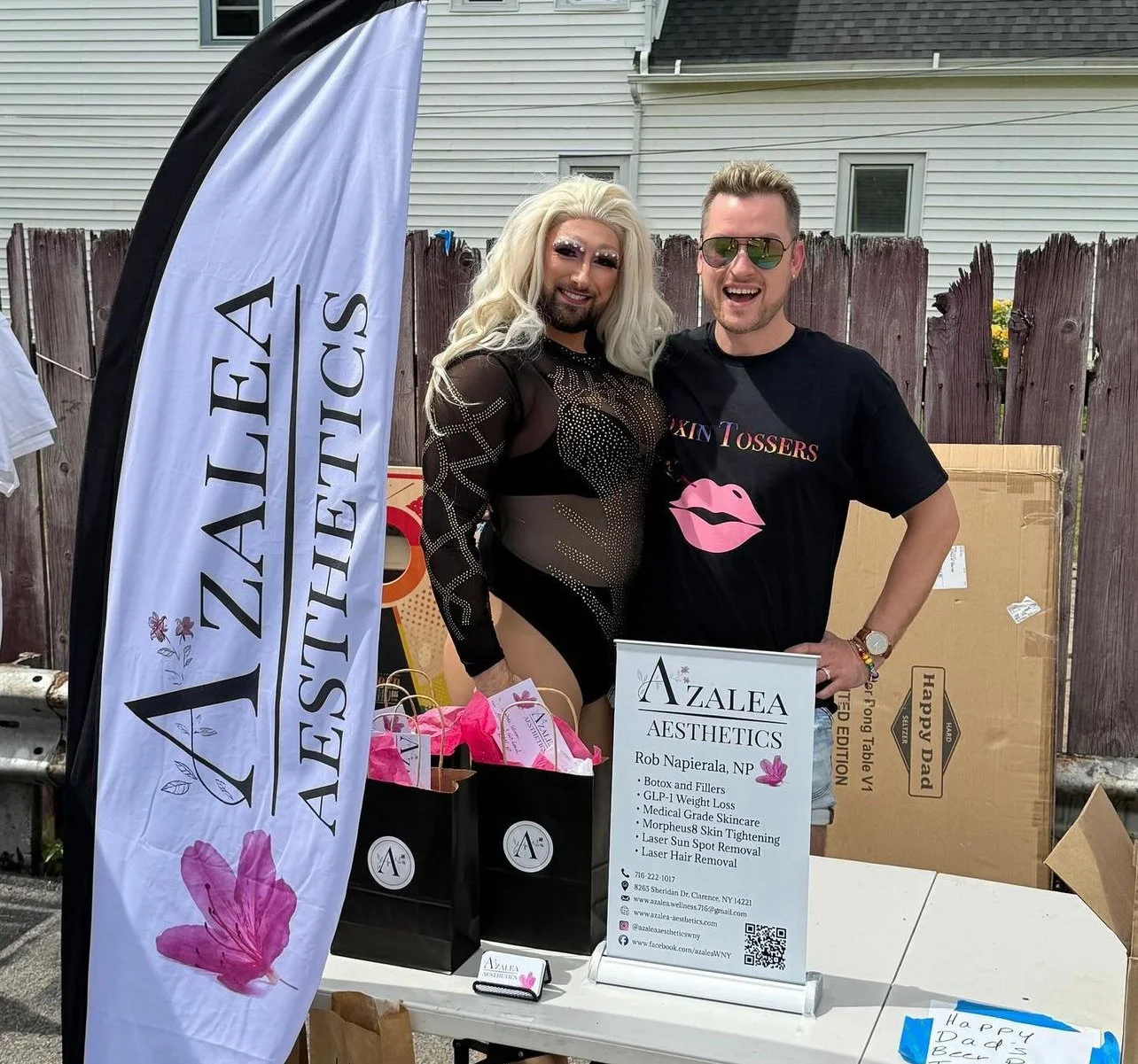 Two people standing behind a table at an outdoor event, with a sign for Azalea Aesthetics, a large flag, and various gift bags. One person is dressed in elaborate makeup and a black mesh outfit, and the other is wearing sunglasses and a black t-shirt