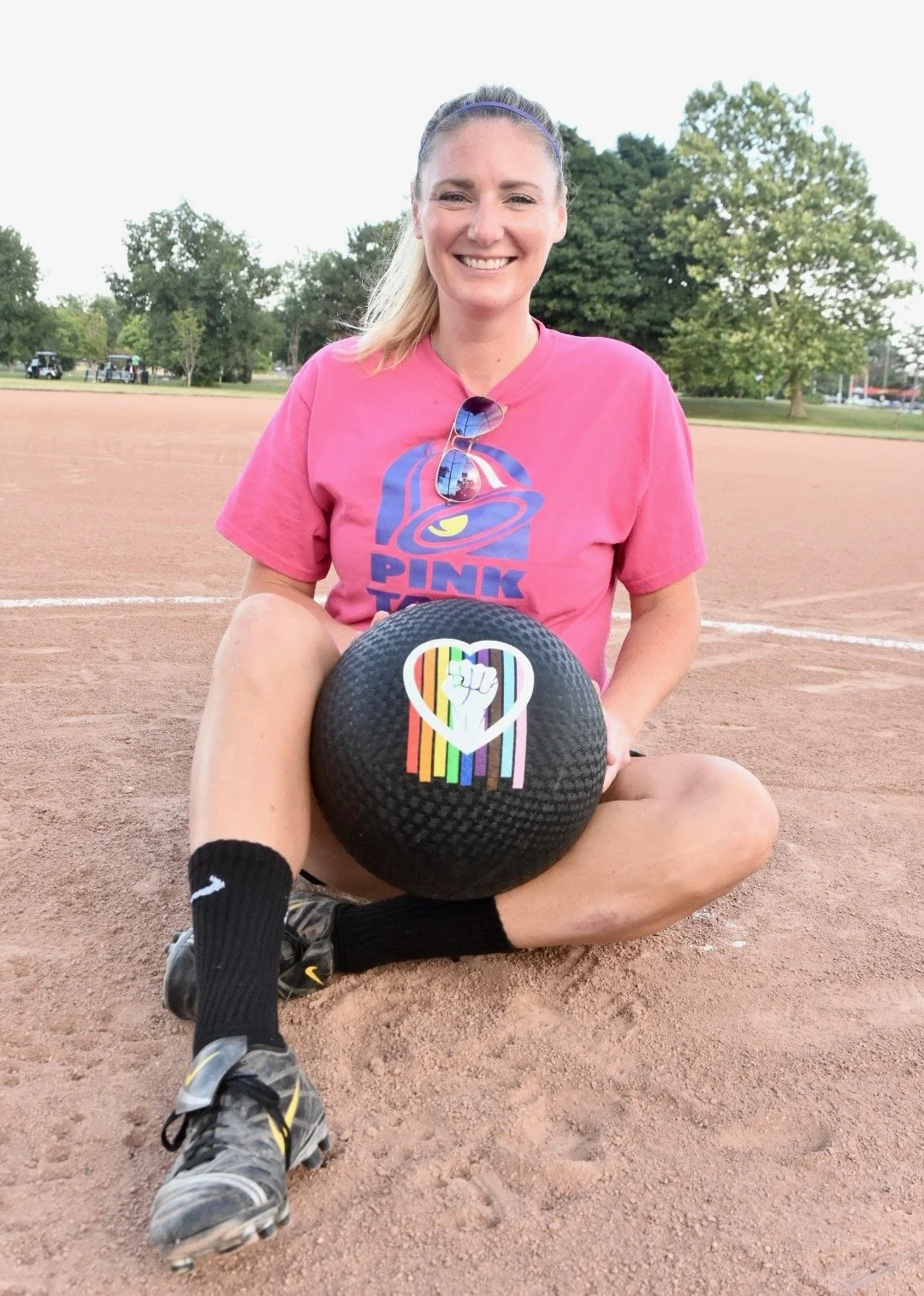 A woman sitting on a baseball field holding a black softball with rainbow and fist logo, wearing pink T-shirt, black socks, and gray athletic shoes, smiling at the camera.