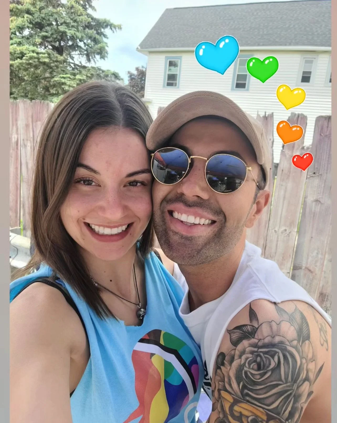 A smiling young woman and a man with sunglasses taking a selfie outdoors in front of a wooden fence, with a house and trees in the background. The image has colorful heart stickers above them.