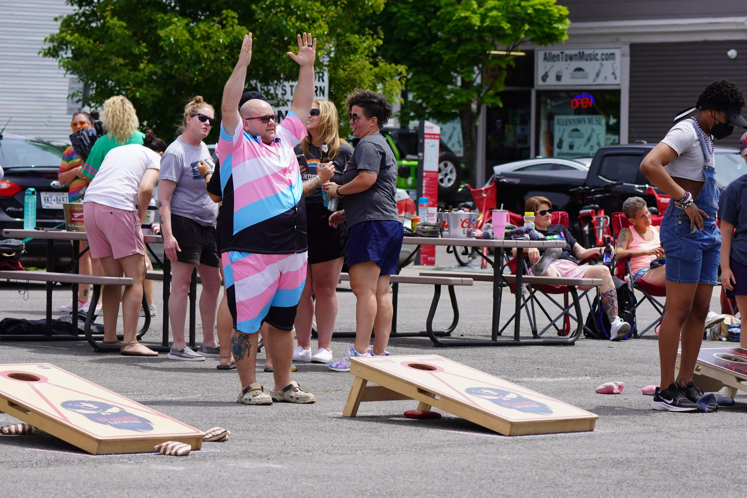 People playing bean bag toss at an outdoor event, some sitting and some standing, surrounded by parked cars and a music store.