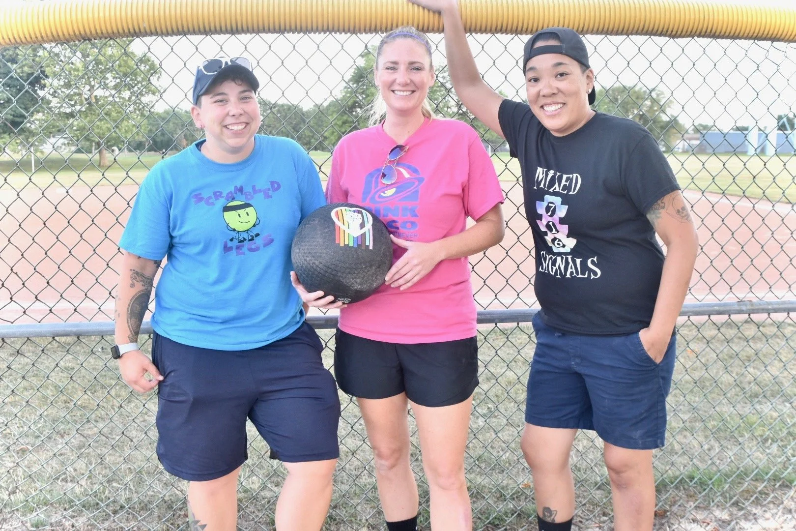 Three smiling women standing by a chain-link fence at a baseball field, holding a black volleyball with a rainbow-colored ribbon sticker. The woman on the left wears a blue t-shirt and shorts, the woman in the middle wears a pink t-shirt and black sh