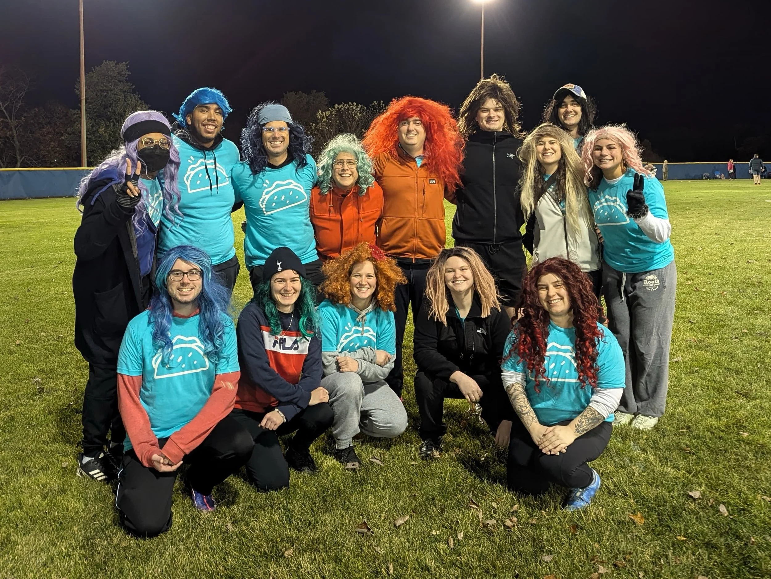 Group of people dressed in colorful wigs and themed T-shirts posing on a grassy field at night.