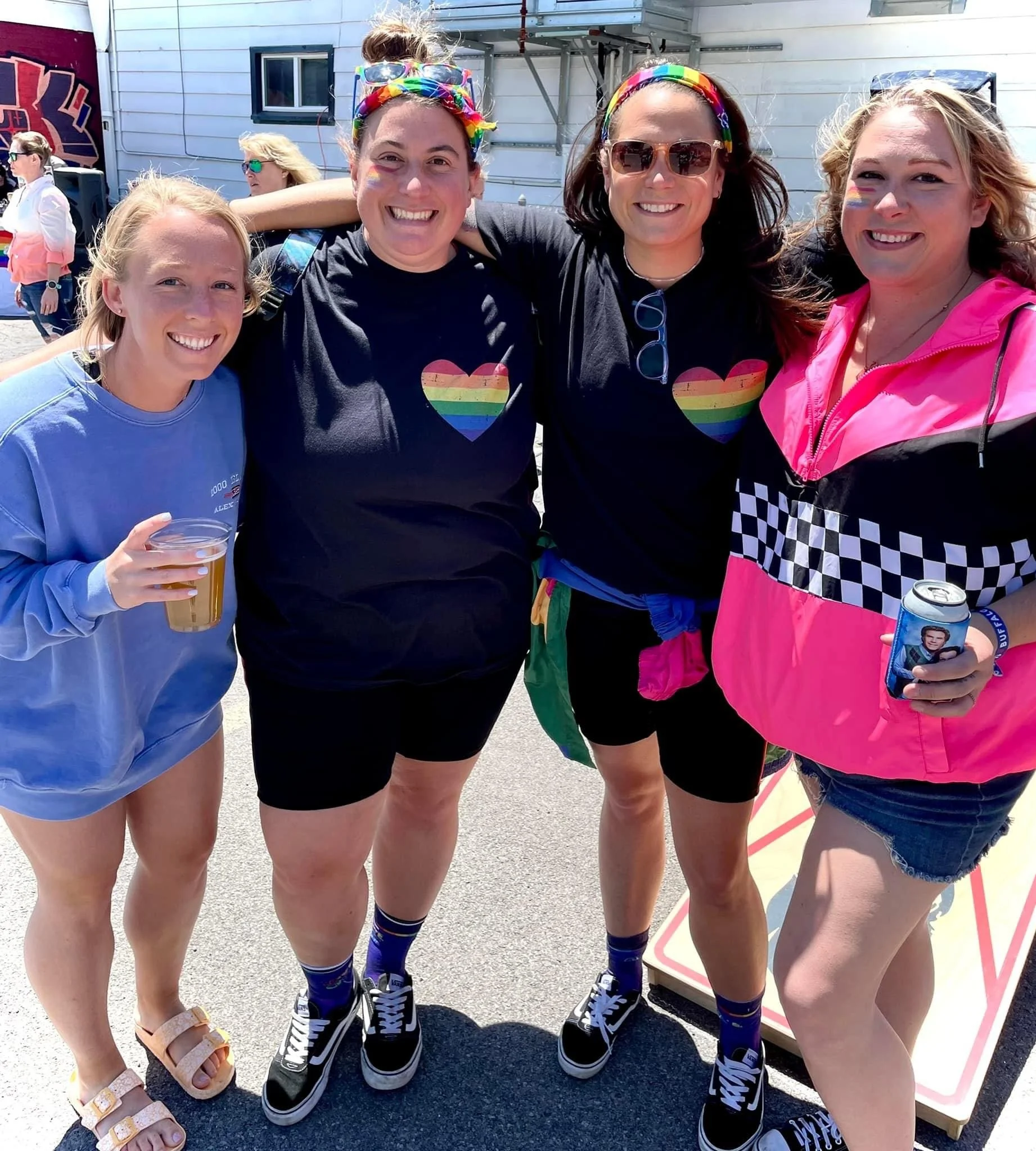 Four women smiling and posing together outdoors on a sunny day, wearing rainbow-themed accessories and shirts with rainbow heart symbols, attending a celebration or gathering.