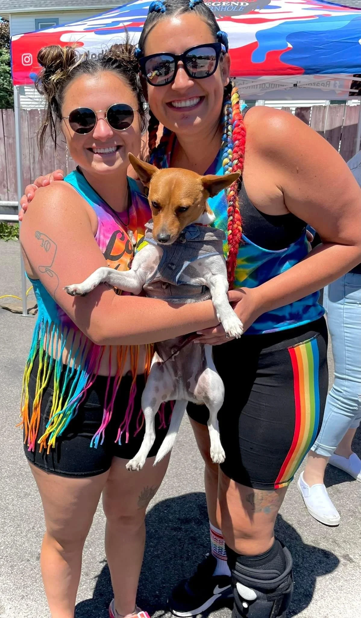 Two smiling women in colorful outfits holding a small dog at an outdoor event with a red, white, and blue canopy in the background.
