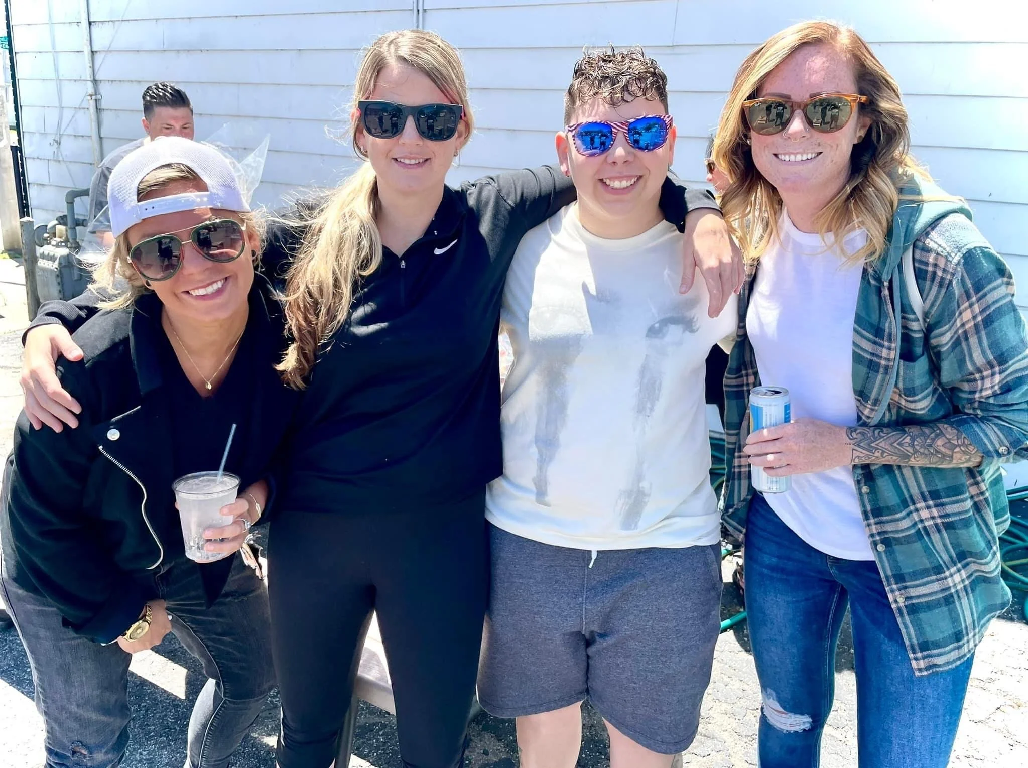 Four women and one man smiling outdoors, wearing sunglasses, some holding drinks, with a blue building in the background.