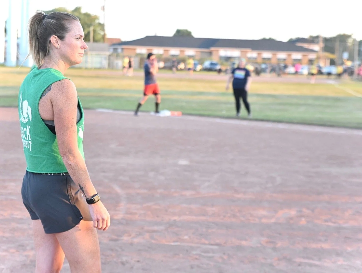 A woman in a green sleeveless shirt and black shorts standing on a baseball field, with other people in the background, possibly during a game or practice.