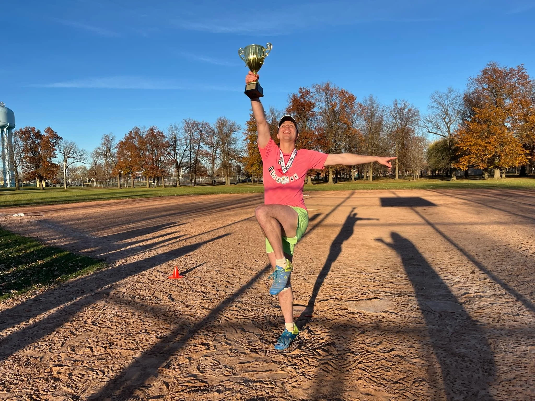 A man celebrating on a sports field, holding a trophy in his right hand, with one leg lifted and arms extended, wearing a pink shirt and green shorts. The scene is outdoors on a clear day with trees in the background and long shadows cast on the grou