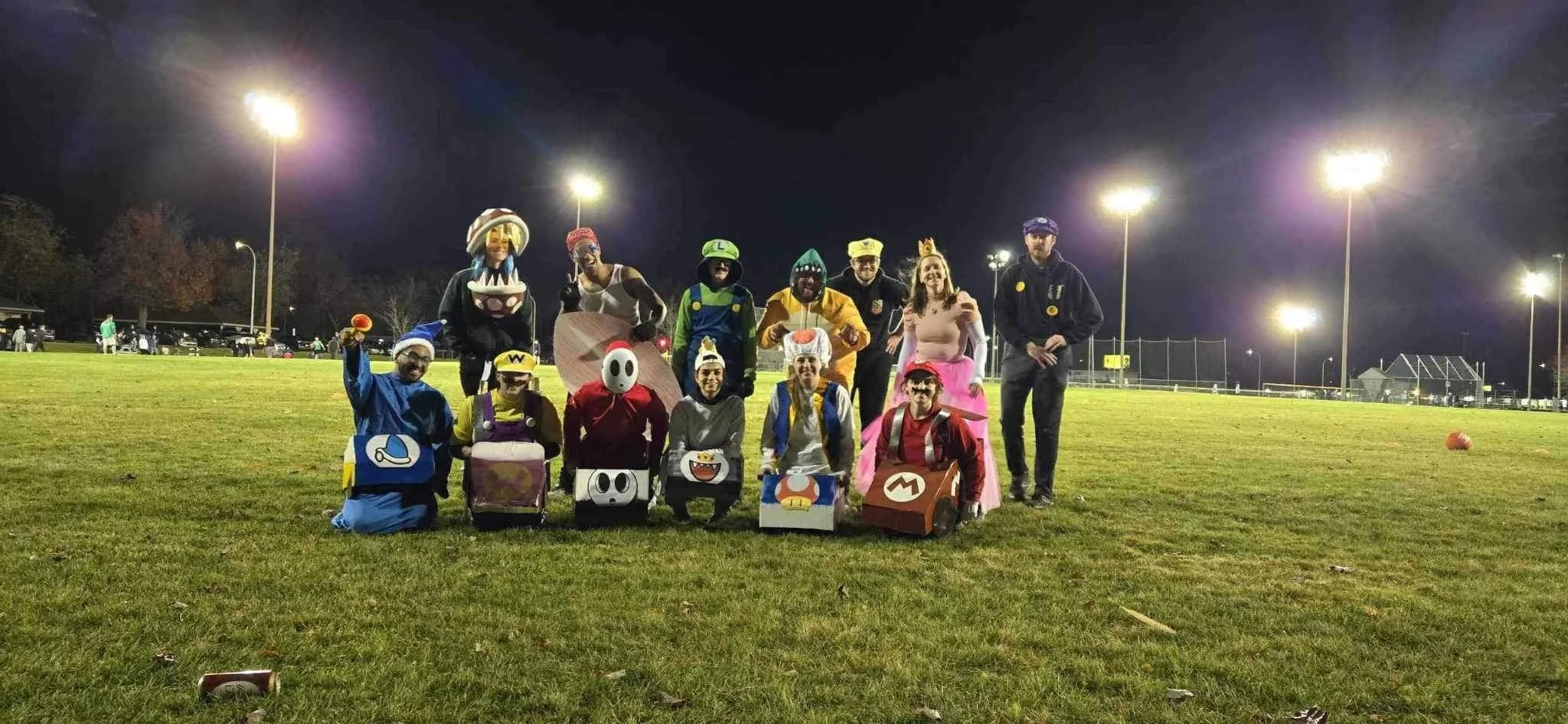 Group of people dressed in Super Mario and other video game character costumes on a sports field at night, illuminated by bright stadium lights.