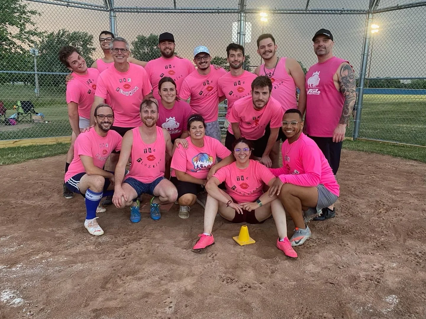 A group of people on a baseball field posing for a photo at sunset. Many are wearing pink or gray athletic shirts, with some kneeling in front and others standing behind. The background features a chain-link fence and trees.