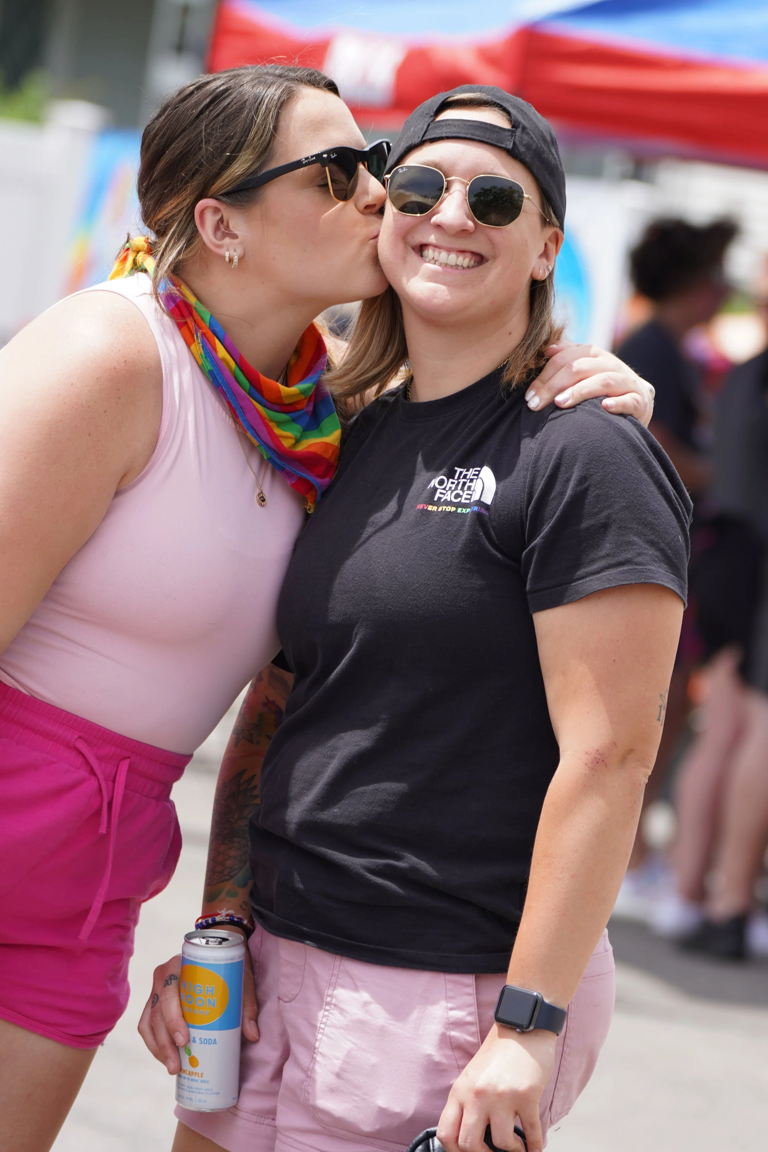 Two women outdoors, one giving the other a kiss on the cheek. The woman on the left is wearing sunglasses, a rainbow bandana, and pink shorts. The woman on the right is smiling, wearing sunglasses, a black cap backwards, a black T-shirt, and pink sho